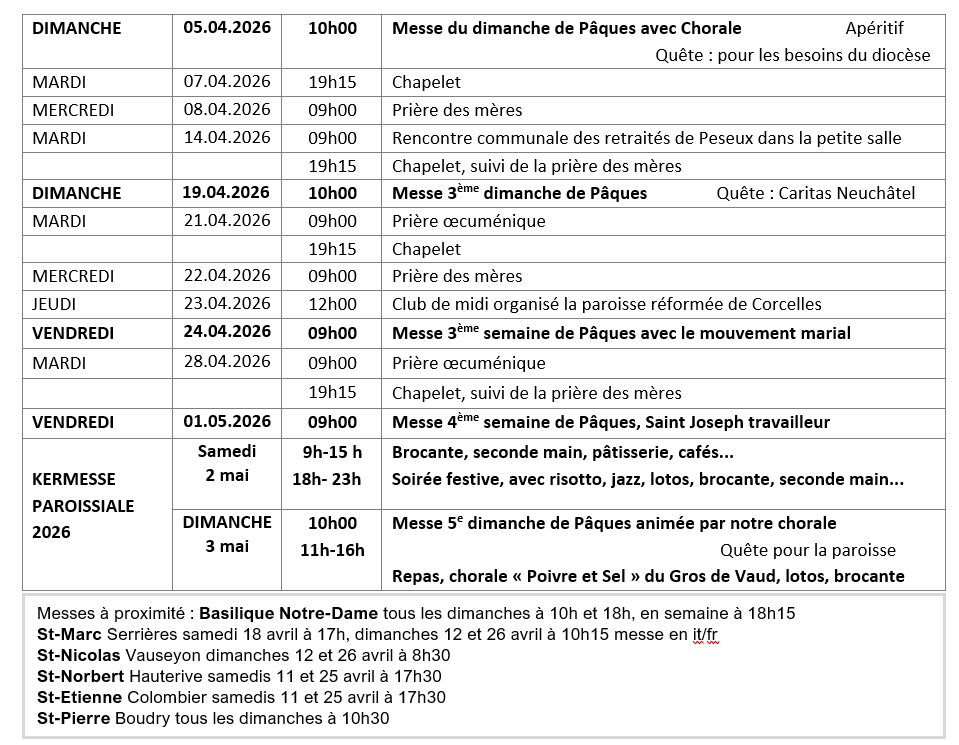 MESSES ET PRIERES A L’ÉGLISE NOTRE-DAME DE COMPASSION – PESEUX – AVRIL – 2026